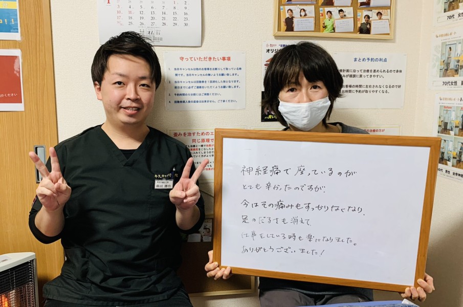 「太ももの痛みと足の痺れがあり、辛かったですが、改善されてとても楽になりました!」