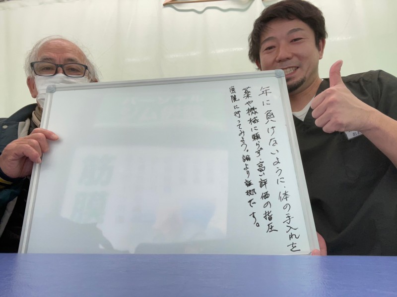 Q、あなたと同じような症状でお悩みの皆様へメッセージがありましたら教えてください。 A、身体全体の硬さがほぐれ、姿勢が良くなってきたと妻が言っております。私自身も若くなってきたと感じております。